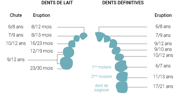 Entre 3 et 12 ans, les dents de lait tombent petit à petit pour laisser place aux nouvelles dents, définitives cette fois. A l’âge de 12 ans, les dernières dents de lait finissent de tomber, et c’est environ à l’âge de 21 ans que les dernières dents adultes apparaitront : les dents de sagesse.